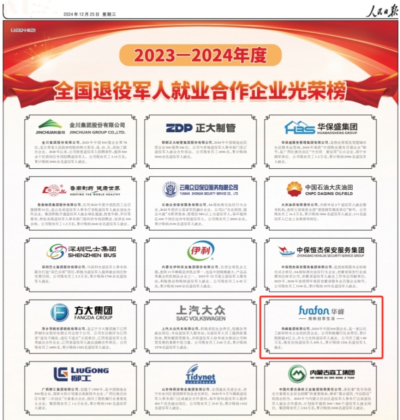 12月25日,《人民日报》第13版全版刊登了“2023—2024年度全国退役军人就业合作企业光荣榜”,华峰集团有限公司光荣上榜。