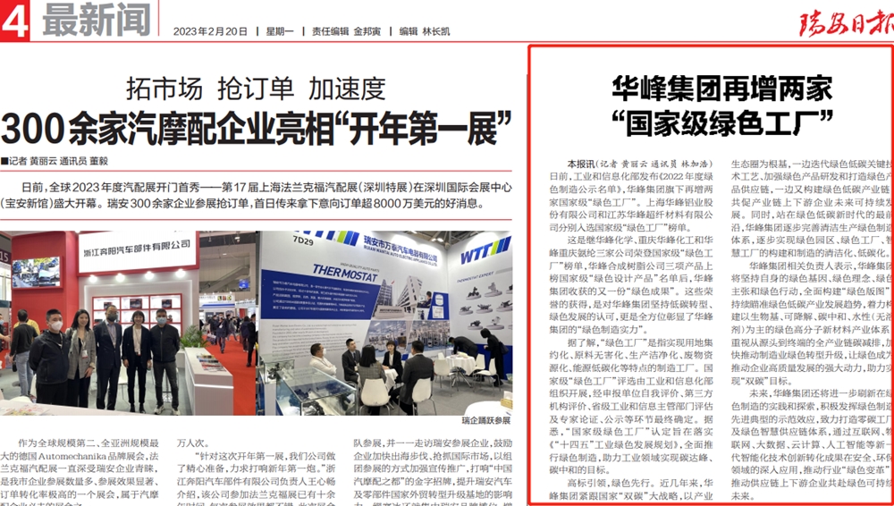 这是继华峰化学、重庆华峰化工和华峰重庆氨纶三家公司荣登国家级“绿色工厂”榜单,华峰合成树脂公司三项产品上榜国家级“绿色设计产品”名单后,华峰集团收获的又一份“绿色成果”。这些荣誉的获得,是对华峰集团坚持低碳转型、绿色发展的认可,更是全方位彰显了华峰集团的“绿色制造实力”。